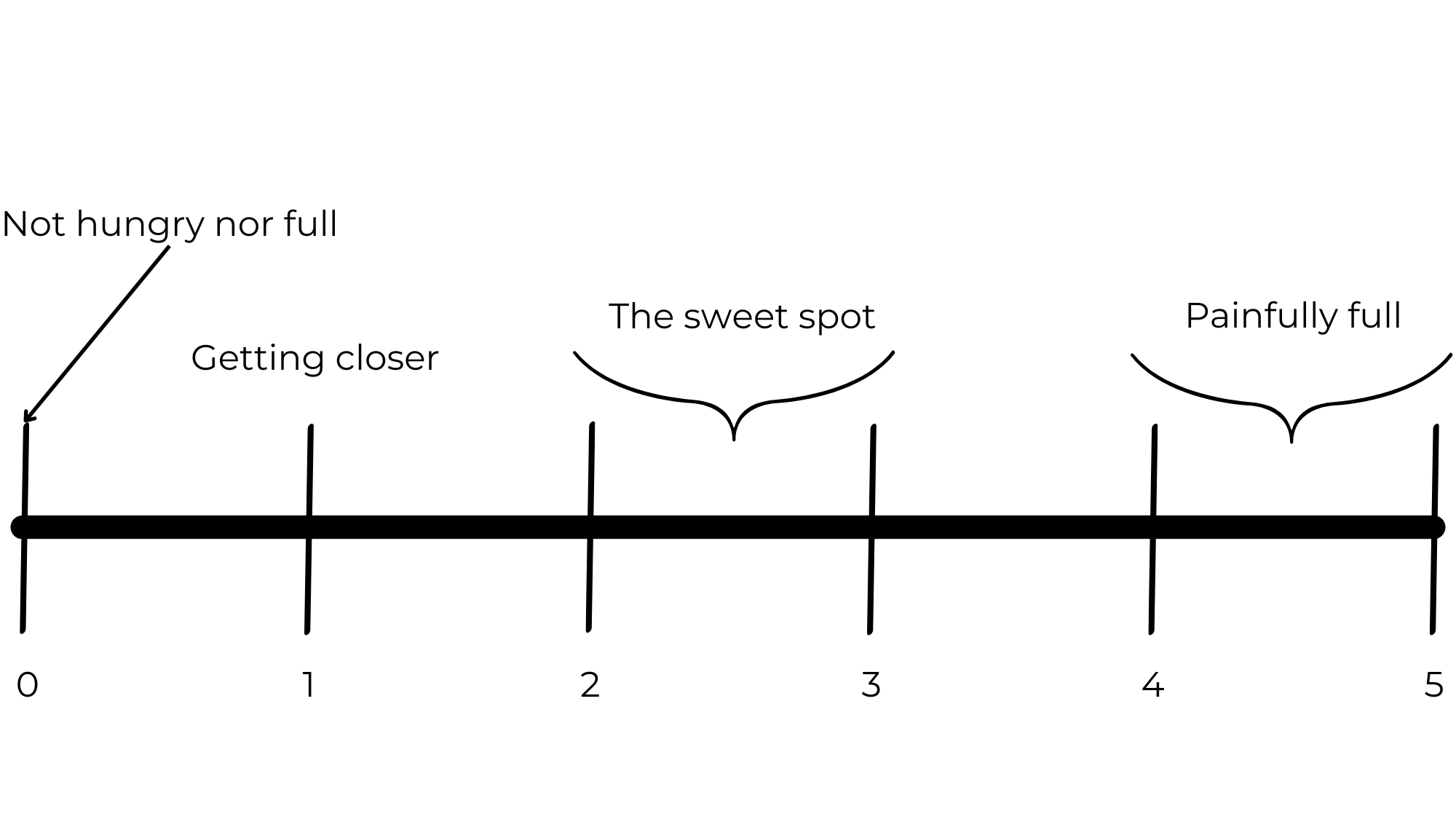 Fullness exists on a spectrum. If we imagine 0 being “neutral” where we are not hungry and not full. While 5 is the fullest we can imagine, often associated with pain, discomfort and fatigue. We may find that a 2-3 level of fullness is the sweet spot where we feel pleasantly satisfied and full for a few hours.