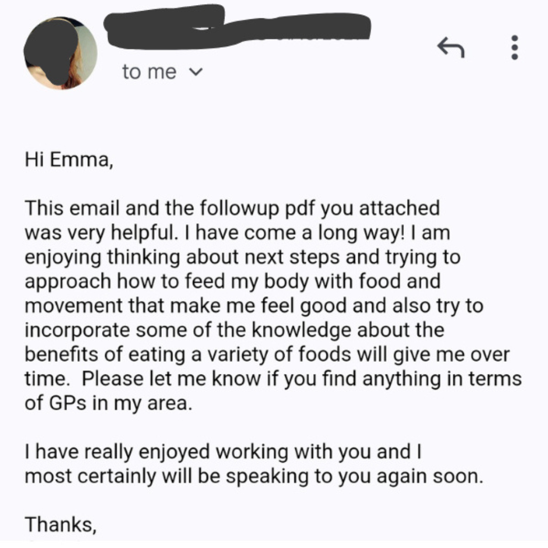 Sessions are then purchased as a part of a package. This is because regular contact is really important for this type of support. I find it benefits both of us this way and helps you find food joy faster.